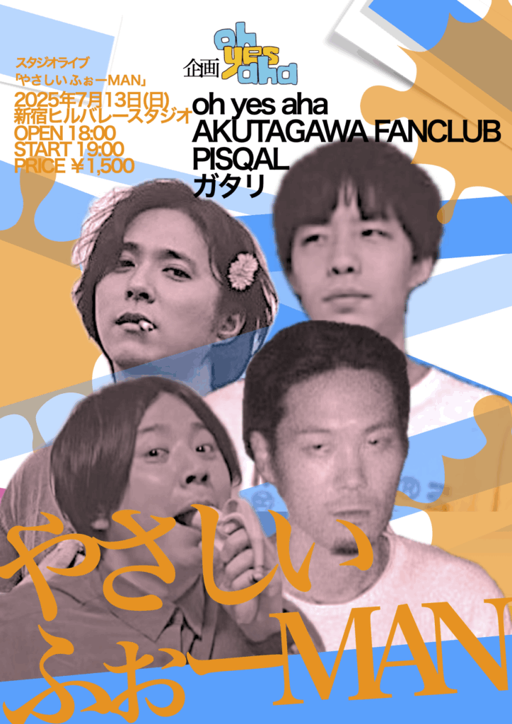 2025年7月13日新宿ヒルバレースタジオ LIVE X Facebook はてブ Pocket LINE コピー 2025.06.292025.06.30 7月13日(日)新宿ヒルバレースタジオ oh yes aha企画スタジオライブ「やさしいふぉーMAN」 出演 oh yes ahaAKUTAGAWA FANCLUBPISQALガタリ